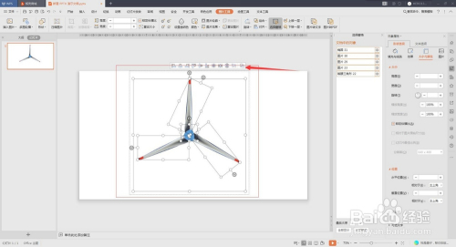 选中所有的外形,组合到一路,然后为组合外形添加陀螺旋动画,可以把之前的正三角形去失落了。