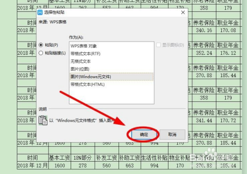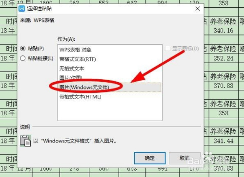 在弹出的“选择性粘贴”对话框,“作为”下面我们选择“图片(Windos原文件)”单击。