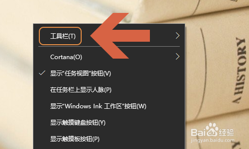 在电脑最下发一个黑色的区域就是使命栏,若是系统是win10,那么鼠标右键点击使命栏今后即可看到下图所示的“东西栏”了;