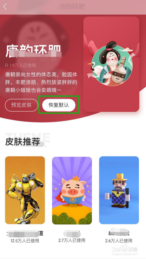 若是没有找到默认皮肤,就在【比来利用】栏中找到今朝正在利用的皮肤,点进去,然后点击【恢复默认】即可!