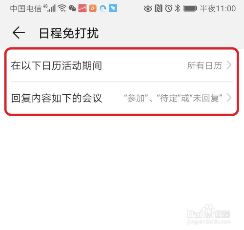 进入【日程免打搅】功能页面后,按照自身环境进行设置,设置好后,响应的日程不再提醒。