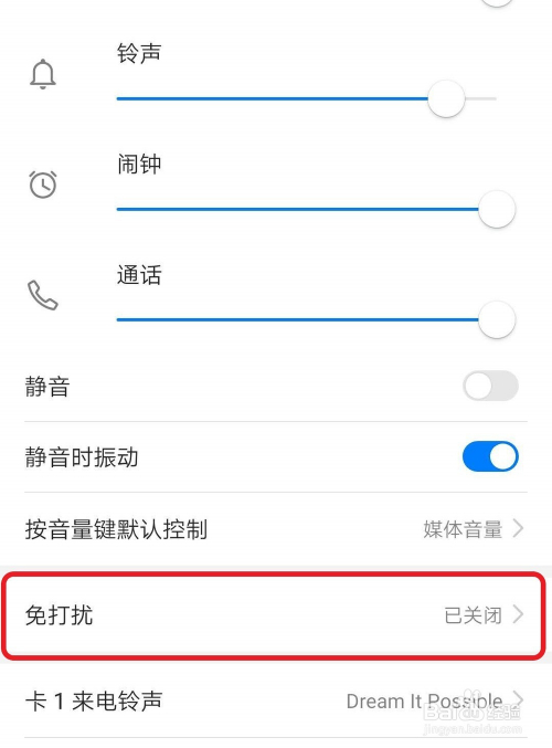 在【声音】功能页面中,找见【免打搅】功能按钮,点击启动【免打搅】功能,进入【免打搅】功能页面。