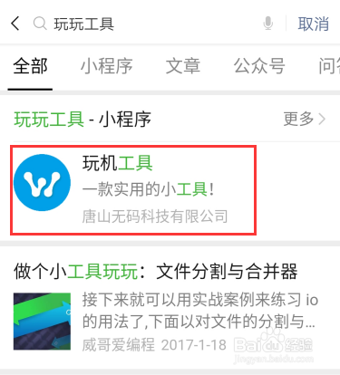 在搜刮栏中输入“玩机东西”点击进入小程序。