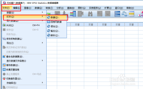 首先,打开spss,在东西栏,点击“文件”,点击“打开”,接着点击“数据”。