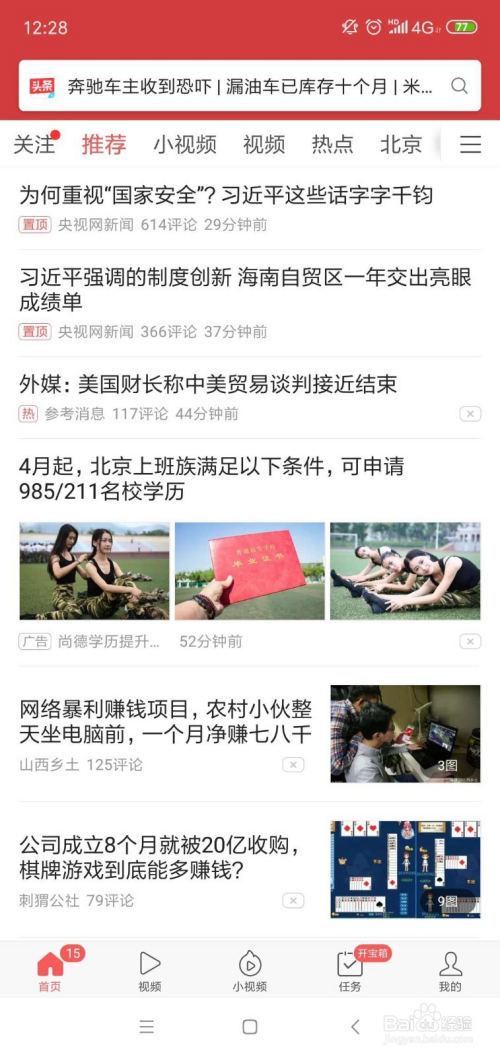 进入今日头条极速版后我们可以看到和通俗今日头条页面是一样的,但我们有多种体例可以赚取一些零花钱。