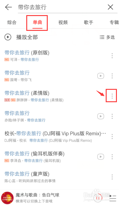 呈现歌曲页面,点击【单曲】,点击歌曲边上的【▪▪▪】。