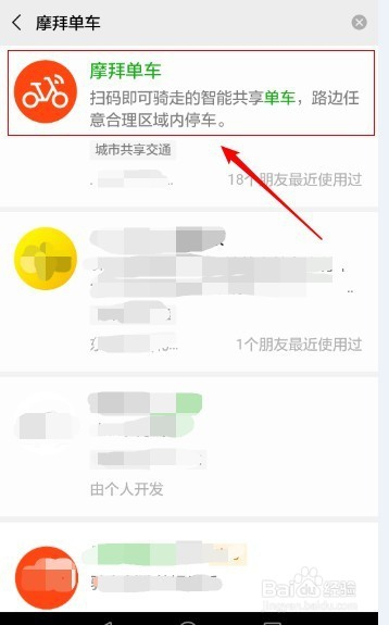 进入摩拜单车页面后,我们可以看到第一条就是我们要找的摩拜单车,点击并进入。