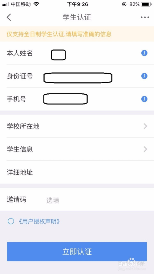 然后打开学生认证的界面中进行填写小我信息、黉舍,若是合适后点击”当即认证“按钮,若是不合适就无法切换到芳华版本。