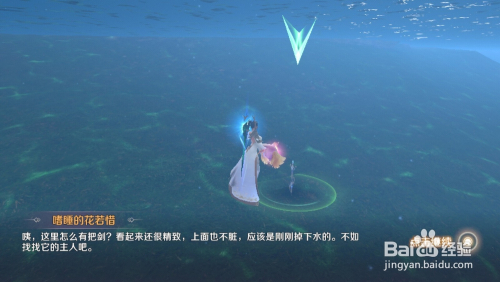 然后前去下图标识位置,会发现一个名为“遗落的剑”的NPC,剑在水中,但在水面可以看到“?”,潜入水中对话,触发使命。