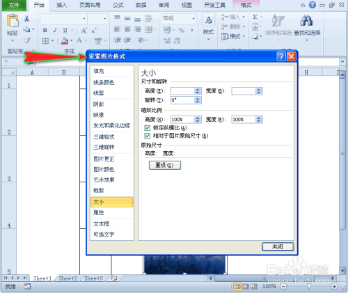 然后我们在“设置图片格局”对话窗左侧项目中单击“属性”,此时右侧会呈现具体内容。如图所示: