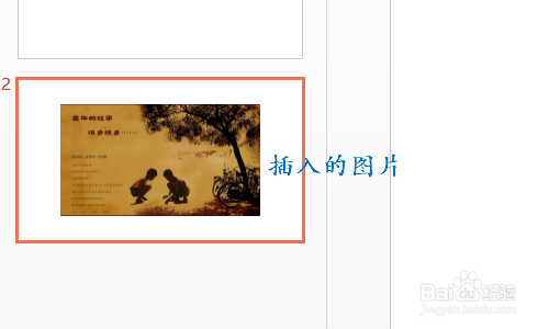 然后在这个新建的空白幻灯片内,依次点击“插入”-“图片”选择一张图片,图二就是小编插入的图片;