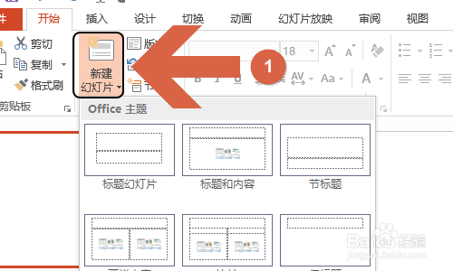 首先打开PPT软件,然后点击开始菜单下方的“新建幻灯片”,然后新建一个空白的幻灯片,见图二...