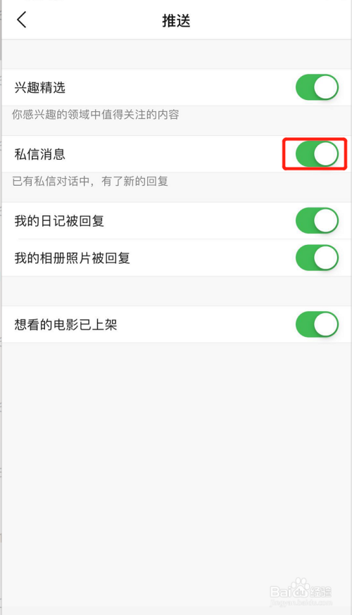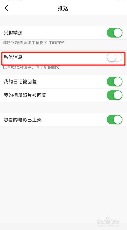 点进去后,在推送本家儿页下找到【私信动静】一栏,滑动此栏右侧的滑块封闭私信动静推送功能!