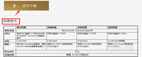进入到游戏登录器下载界面,我们可以在这里看到对于CSGO的电脑最低设置装备摆设。小伙伴们可以看下哦,若是达不到这个要求,下载下来必定也是不克不及兴奋玩耍的啦~合适要求后,我们点击【官方下载】即可。