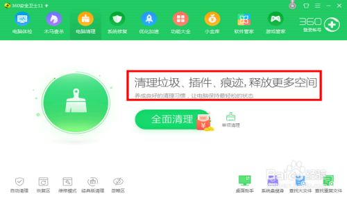 点击后,我们会来到360安全卫士的本家儿界面。我们可以在本家儿界面的上方菜单栏中找到【电脑清理】这一选项,点击它。