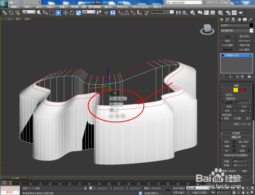 继续对缺口的鸿沟进行切角。点击【鸿沟】图标,选中图示模子上的鸿沟后,点击【切角】右边的小方框,并按图示设置好切角的各个参数。完当作后对选中的鸿沟进行缩放(如图所示);