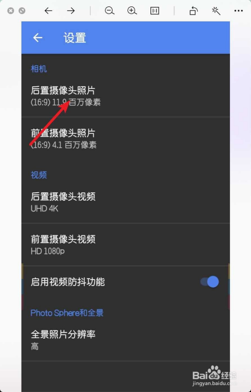 设置照片分辩率,点击照片镜头,选择你要的分辩率。