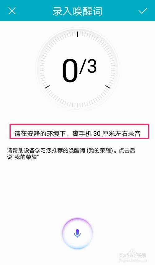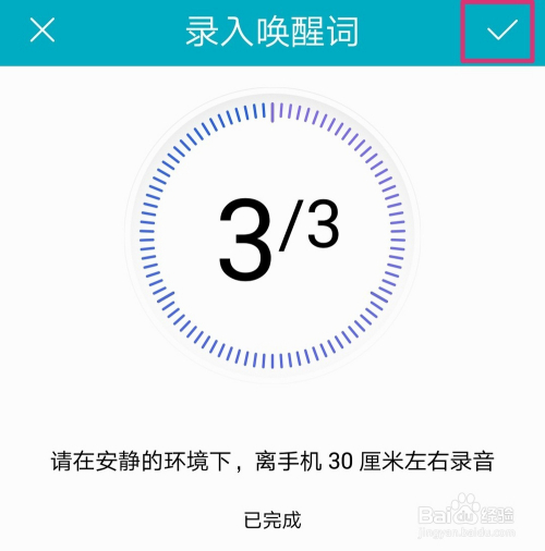 然后就会提醒【录入叫醒词】,大师按照要求,距离手机30厘米摆布录入三遍就会主动保留。