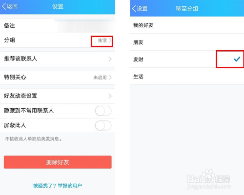在该设置里面点击分组,例如原本在“糊口组”里面,然后点击其他分组如“发家组”勾选就可以移动该分组里
