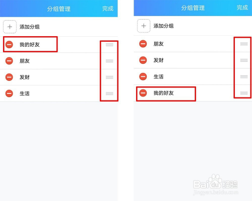 也可以右滑三个线会呈现一个删除红框点击删除,会呈现删除分组对话框然后分组类的老友回到默认分组