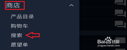 进入到steam本家儿界面后,我们往左上角看去有一个三条杠的图标,我们点击它。然后,我们在弹出来的列表中,找到【商铺】,接着点击【搜刮】。
