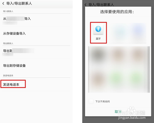 接着点击发送德律风本会呈现应用对话框,然后选择蓝牙会传输另一部已经开启蓝牙手机中