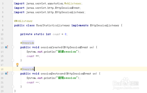 import javax.servlet.annotation.WebListener;import javax.servlet.http.HttpSessionEvent;import javax.servlet.http.HttpSessionListener;@WebListenerpublic class UserStatisticsListener implements HttpSessionListener { private static int count = 0; @Override public void sessionCreated(HttpSessionEvent se) { System.out.println("建立session"); count ++; } @Override public void sessionDestroyed(HttpSessionEvent se) { System.out.println("销毁session"); count --; }}