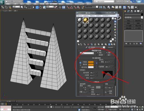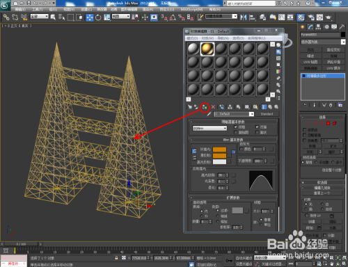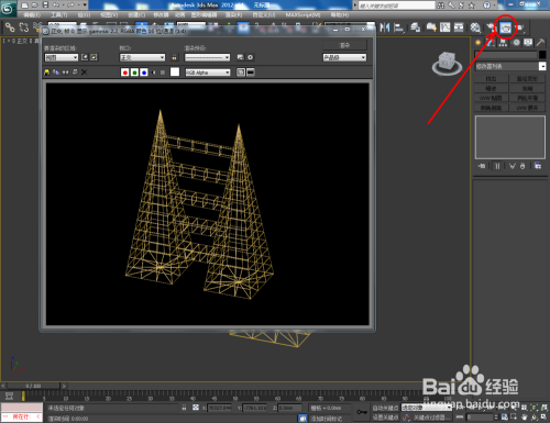 点击【材质编纂器】,按图示设置一个金属线框材质球并附加给模子。最后,点击【衬着】将我们经由过程可编纂多边形鸿沟桥建造出来的模子衬着出图即可。