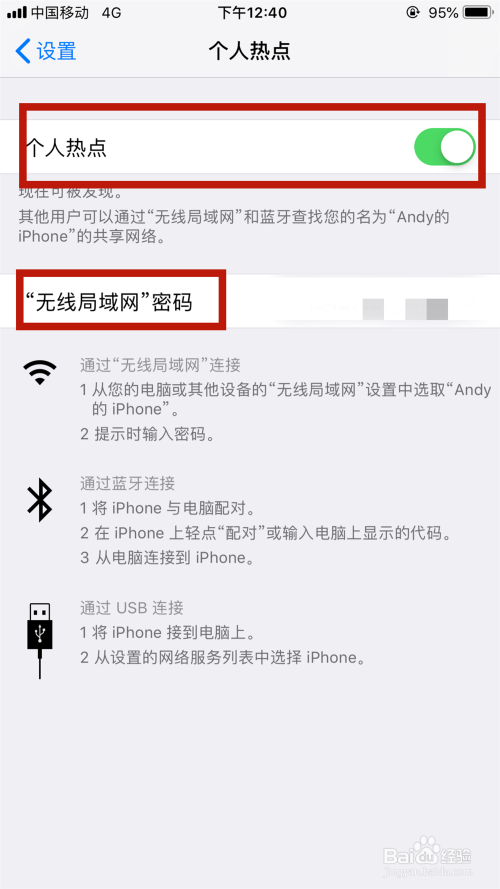 打开小我热点的按钮,同时记住“无线局域网”的密码