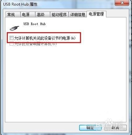 9、在打开的也窗口中点击“电源办理”选项卡,去失落“许可计较机封闭此设备以节约电源”,点击“确定”按钮(依次对每个USB Root Hub的属性进行点窜)。