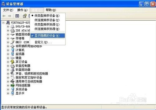 4、打开设备办理器,在菜单栏点击“查看” - “显示埋没的设备”。