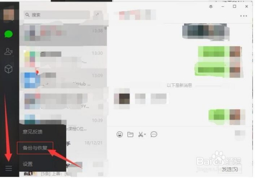 然后点击PC端微信下方的形式“三”,然后点击“备份与恢复”,然后我们可以按照本身的环境将手机聊天记实恢复到我们的手机上或者是电脑上;