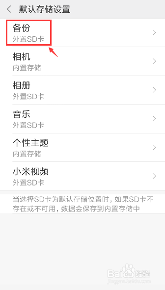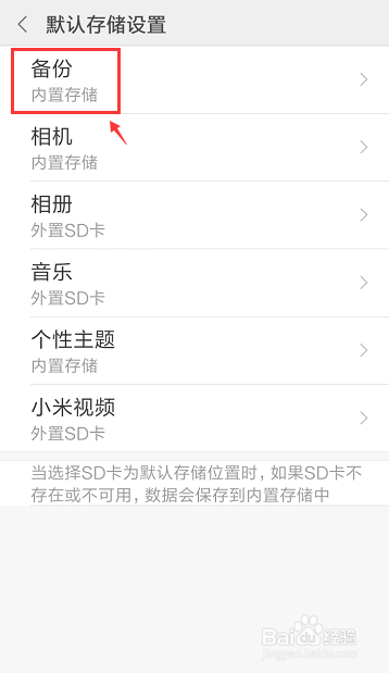 进入默认存储设置页面,选摘要点窜的选项,好比:点击【备份】。