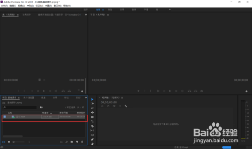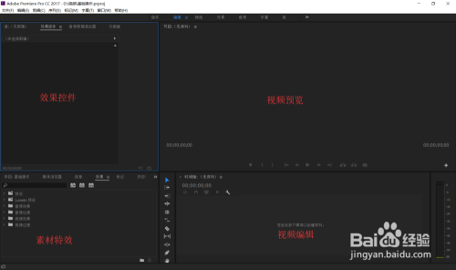进入PR的默认的编纂面板,我们可以看到四大块:结果控件、视频预览、素材箱和时候轴。