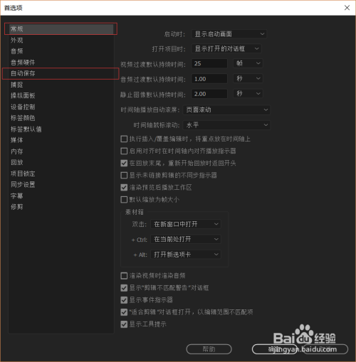 我们首先要设置一下pr的默认设置,在编纂>首选项>界面中设置默认的导入图片的持续时候、过度的默认时候;设置主动保留的时候。