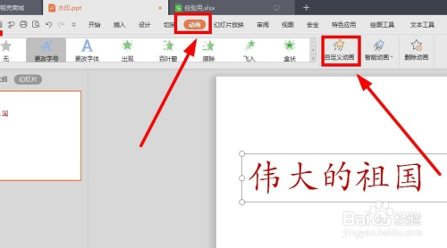 从头在最上面的菜单栏中找到“动画”选项卡,点击下面的“自界说动画”按钮。