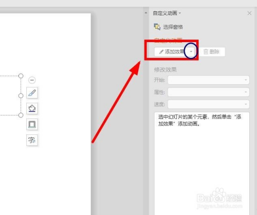 在屏幕的右侧呈现自界说动画的东西栏,找到“添加结果,点击它旁边的标的目的下的小三角。