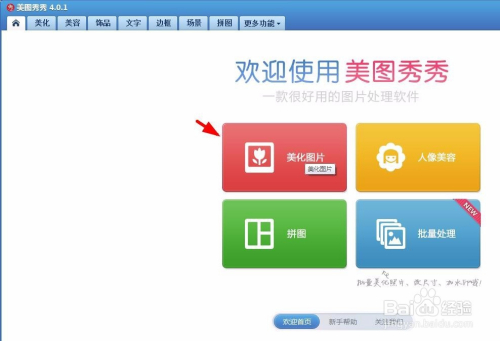 第一步:打开美图秀秀软件,单击“美化图片”按钮。