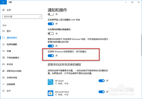 标的目的下滑动页面,开启“在利用Windows系统是获取提醒、技巧和建议”的功能开关;
