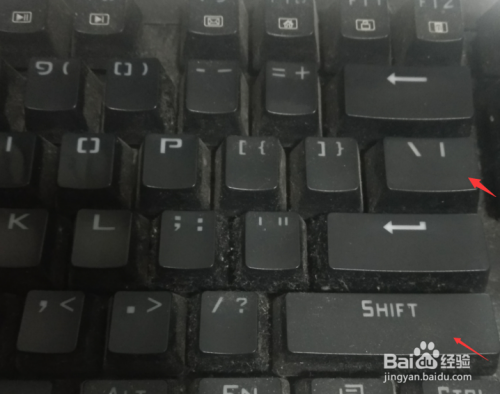 然后先按住键盘上的shift按键,再按下有个斜杆+竖线的符号“\ |”按键,如下图所示: