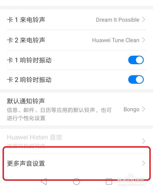 进入【声音】功能页面后,手指在屏幕上标的目的上滑动,将页面拖到最下方,显示出【更多声音设置】功能,点击启动【更多声音设置】功能。进入【更多声音设置】功能页面。