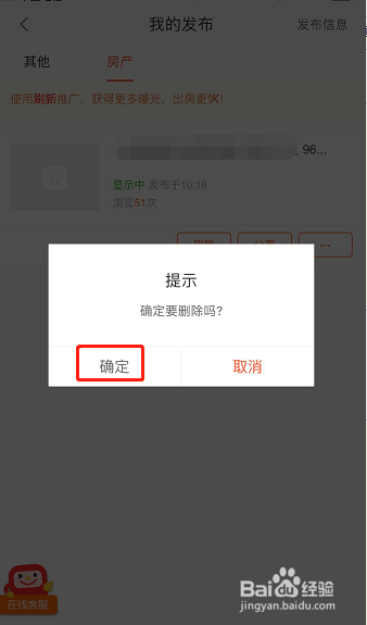 点击后,屏幕中间会弹出如图所示简直认对话框,点击该对话框中的【确定】按钮,点击后即可删除该条发布的信息!