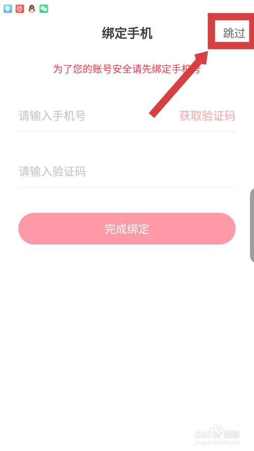 会打开绑定手机界面,可以不消绑定手机号,点击右上角的跳过。
