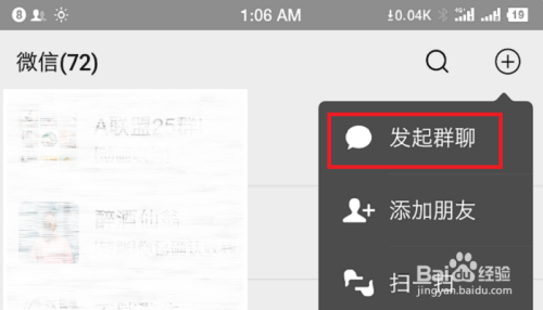 点击加号后,我们会发现这个时辰跳出来一个黑色的框,而此中,第一个选项就叫做【倡议群聊】,我们点击它。