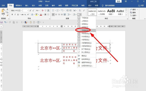选中整个表格,找到菜单栏“段落”选项组中的“边框”后面的下拉箭头,鄙人拉菜单选中“无框线”单击