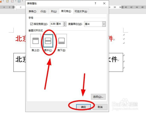 在“表格属性”对话框,选择“单位格”选项卡,“垂直对齐体例”中选择“居中”后单击“确定”