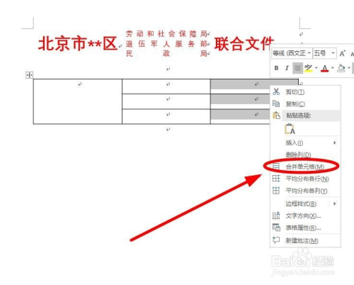 选中第一列的三个单位格,鼠标右键单击右键菜单的“归并单位格”