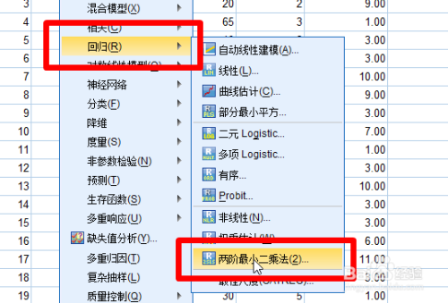 然后点击菜单栏中的【阐发-回归-两次最小二乘法】
