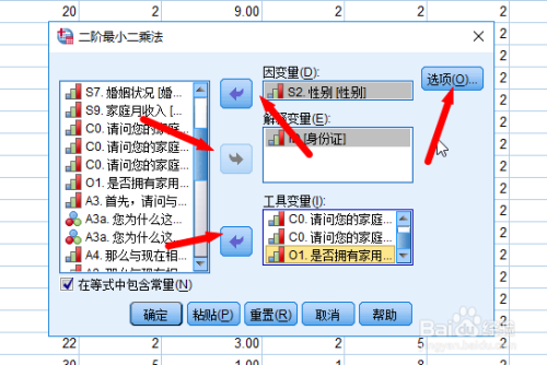 然后将【自变量】和【诠释变量】以及【东西变量】放入各自的对话框,并点击对话框右上角的【选项】