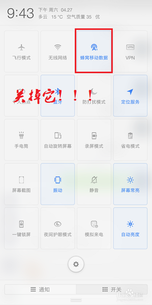 此刻小编就来给大师讲一下如何节制本身出所出的到底是铰剪,石头,仍是布。我们需要先把手机上方的使命栏滑下来,然后,把我们的蜂窝移动数据给封闭了。